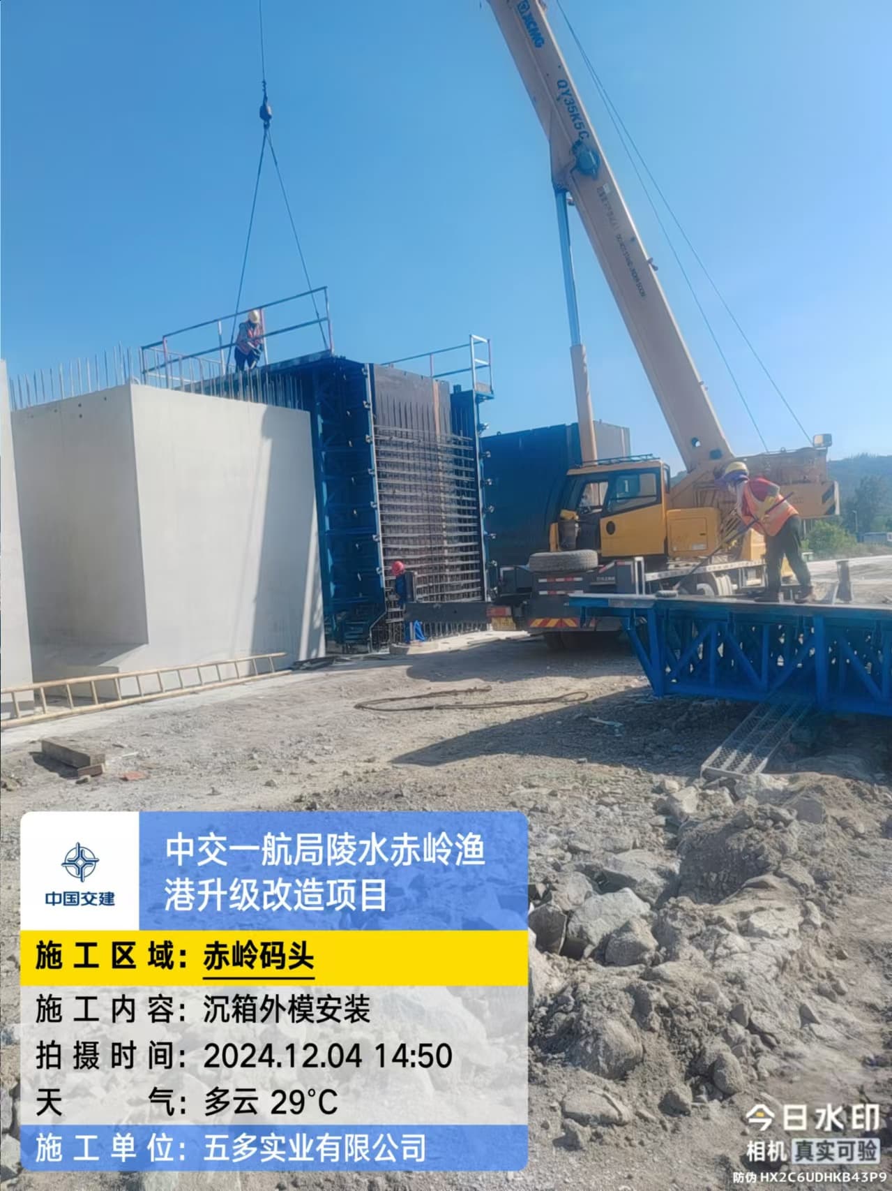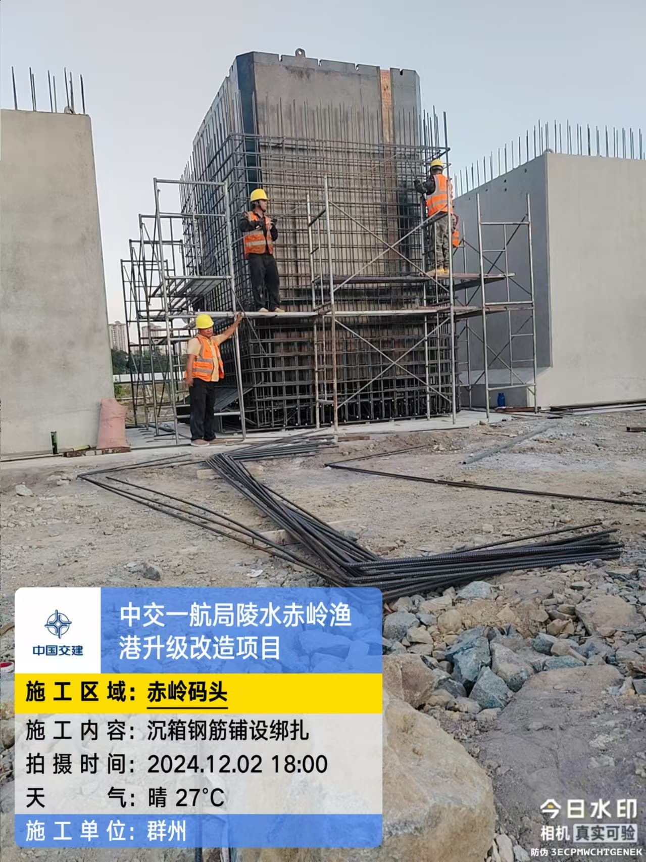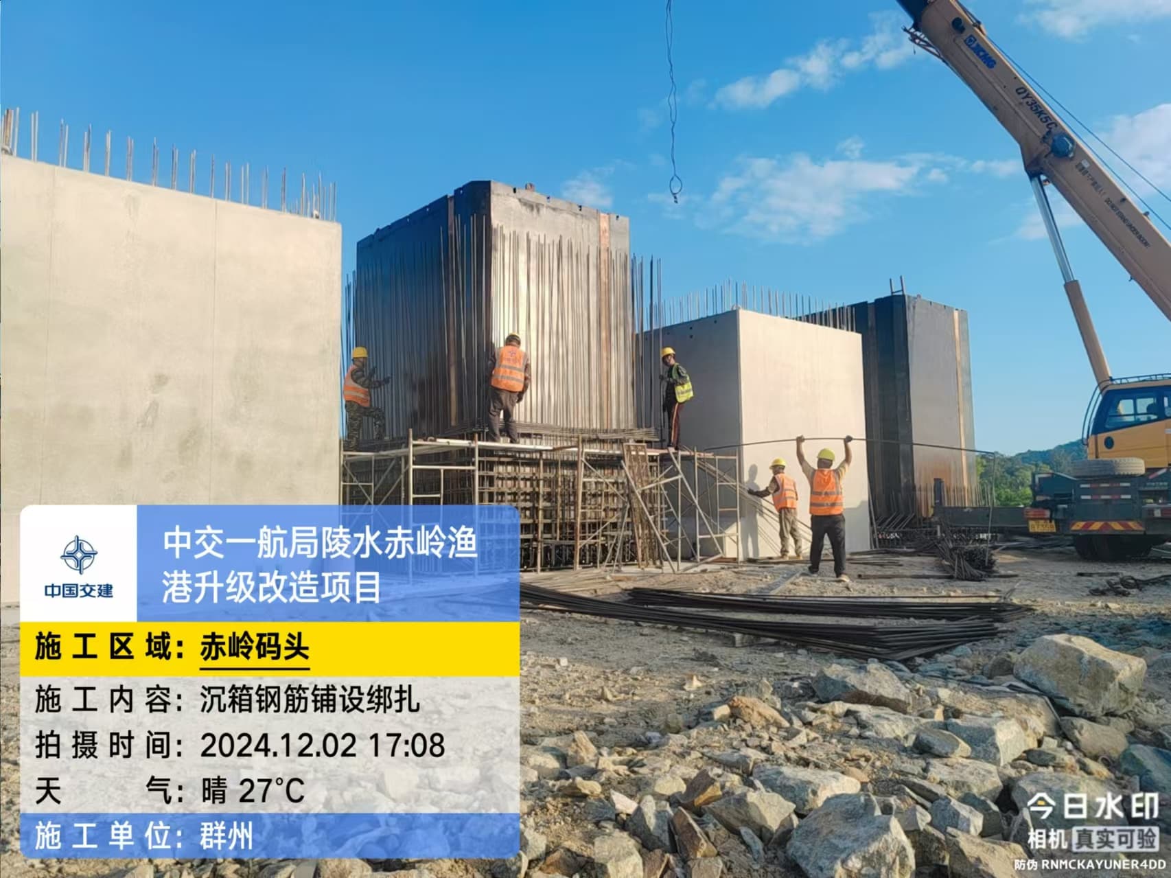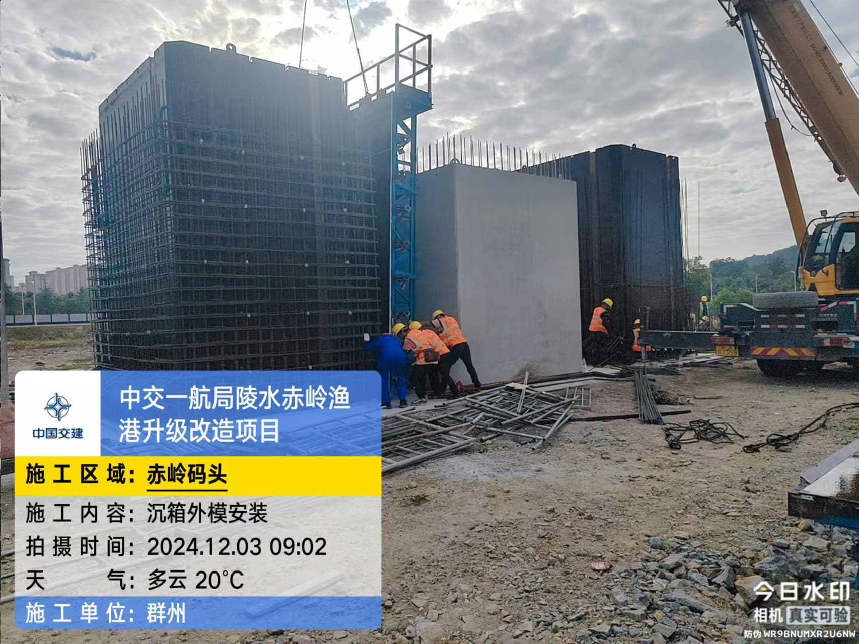 沉箱预制、抛石回填平整、钢筋绑扎、模板支拆、混凝土浇筑
