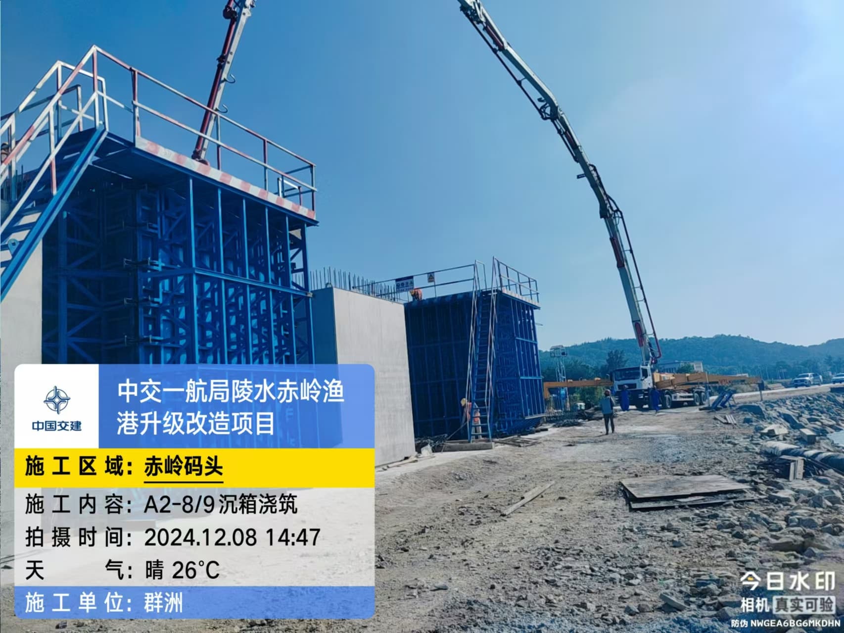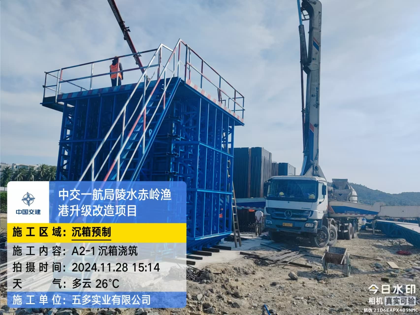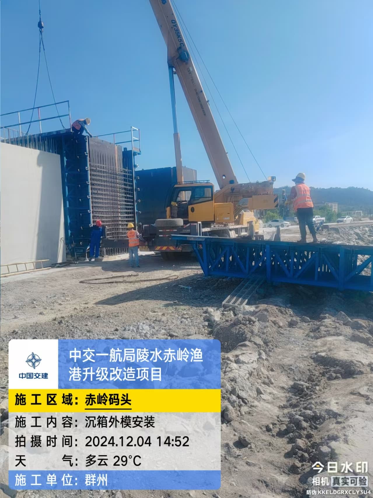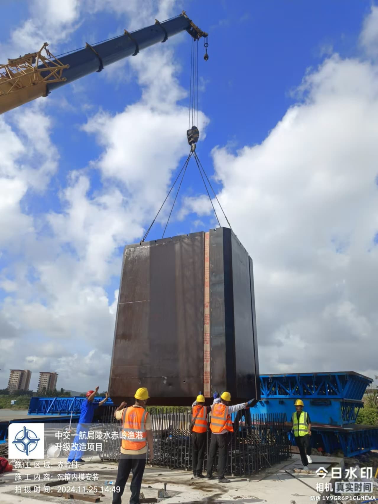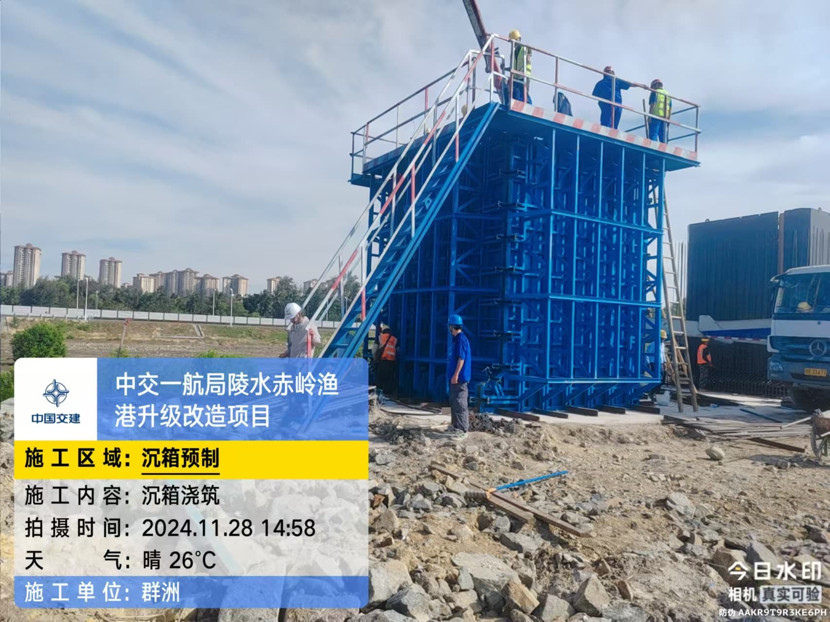 沉箱预制、抛石回填平整、钢筋绑扎、模板支拆、混凝土浇筑