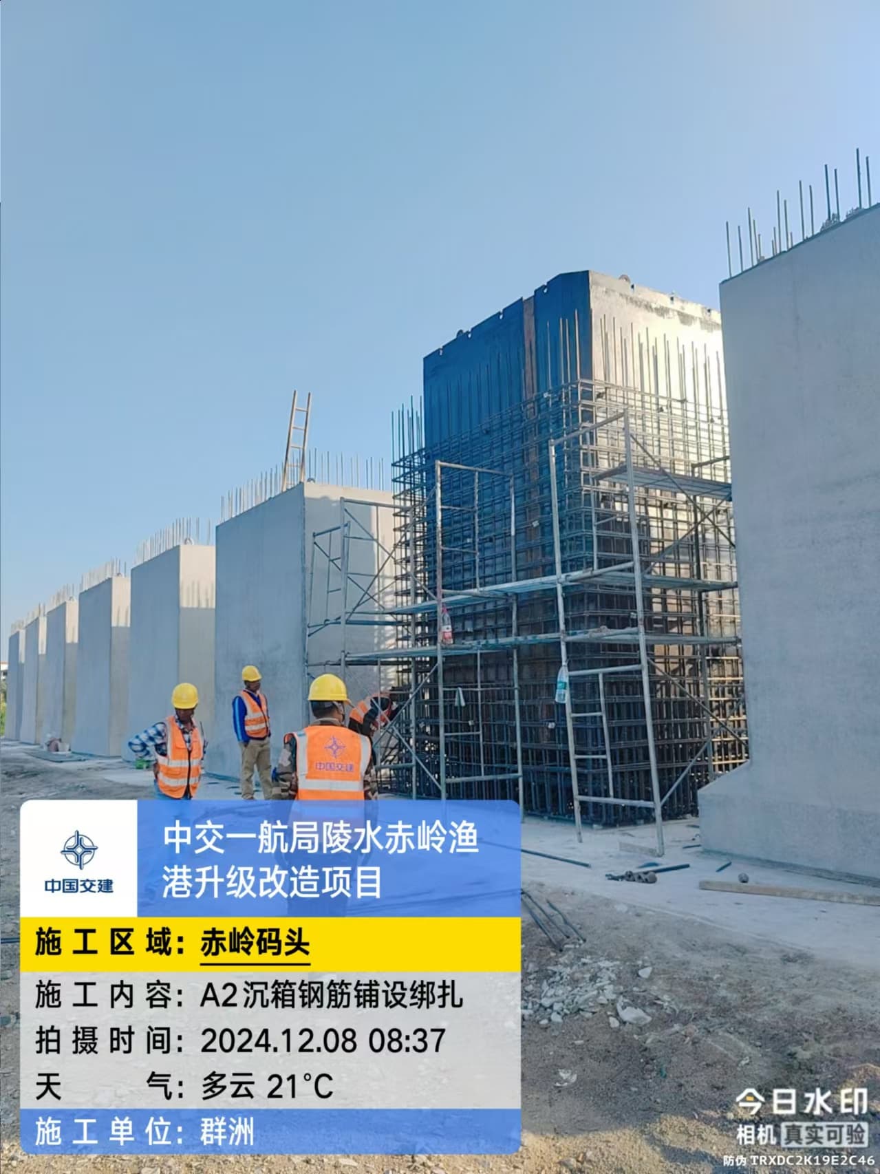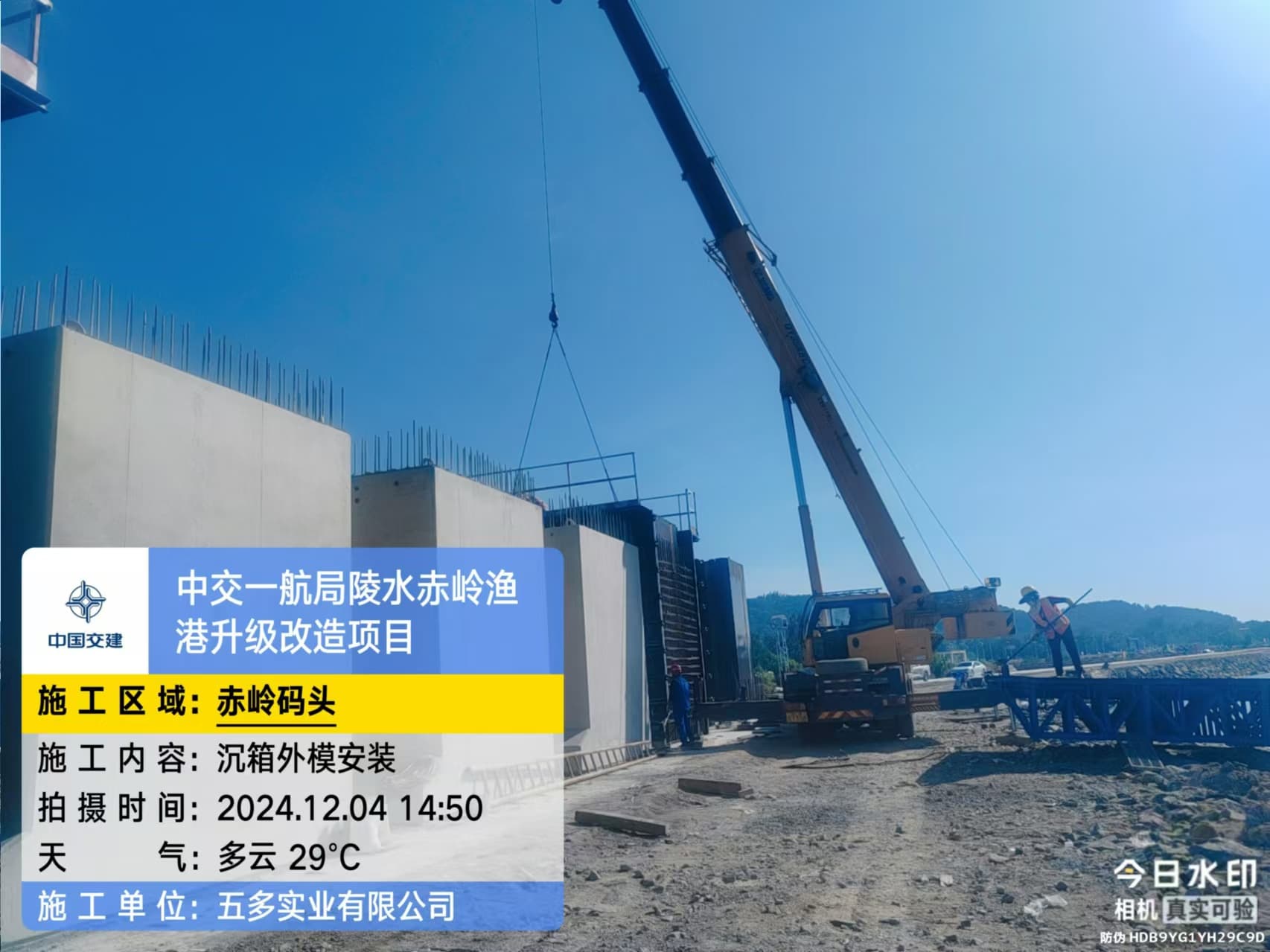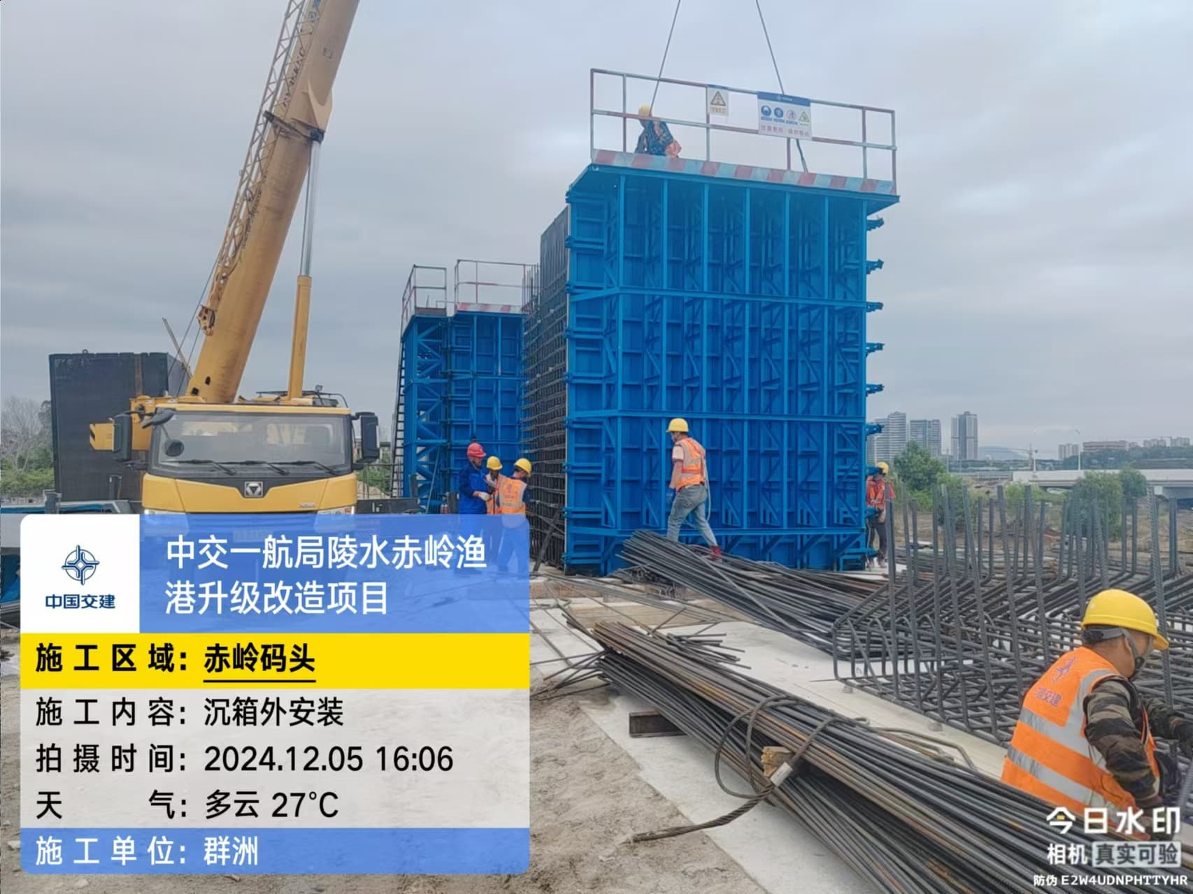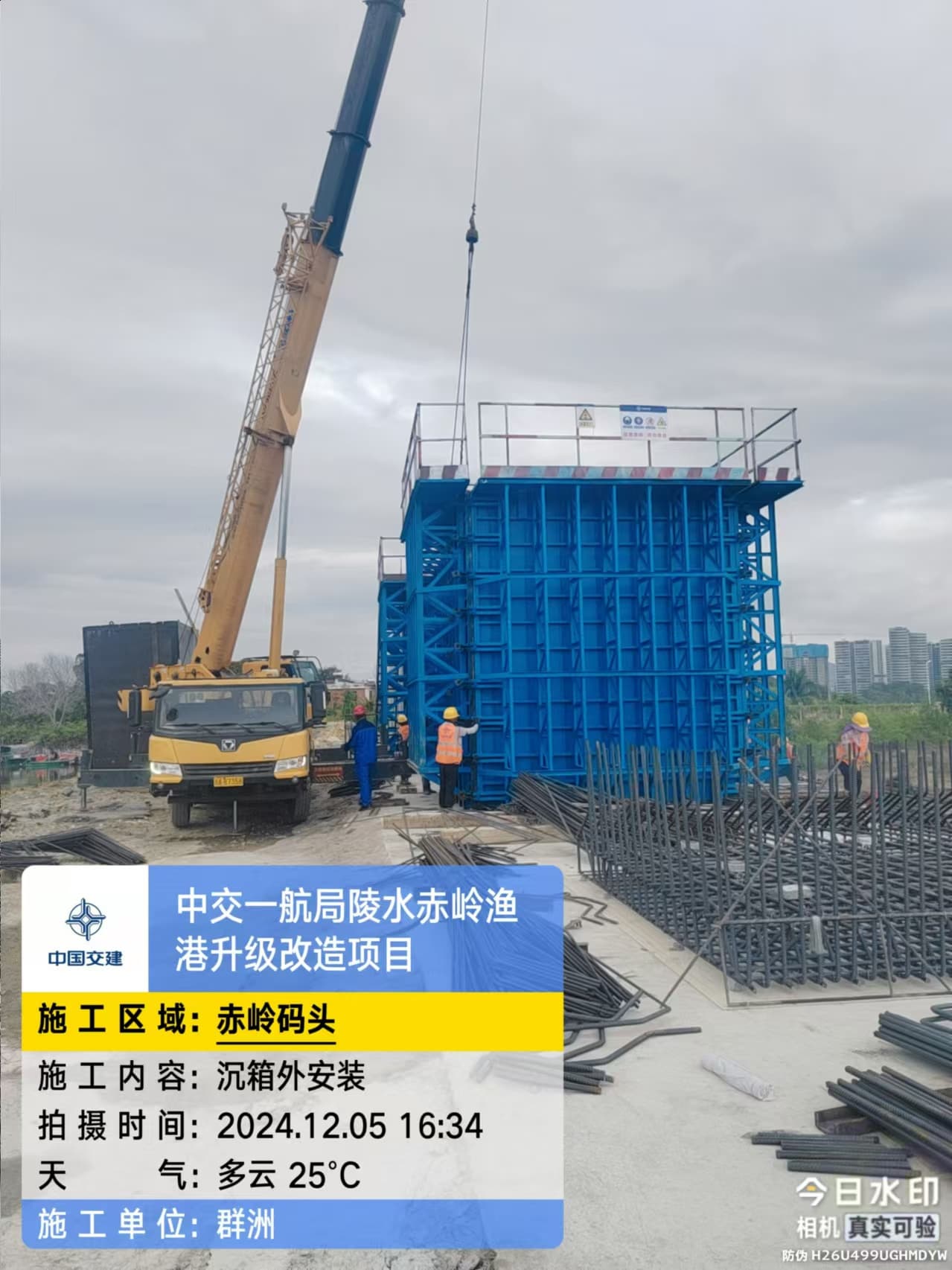 沉箱预制、抛石回填平整、钢筋绑扎、模板支拆、混凝土浇筑