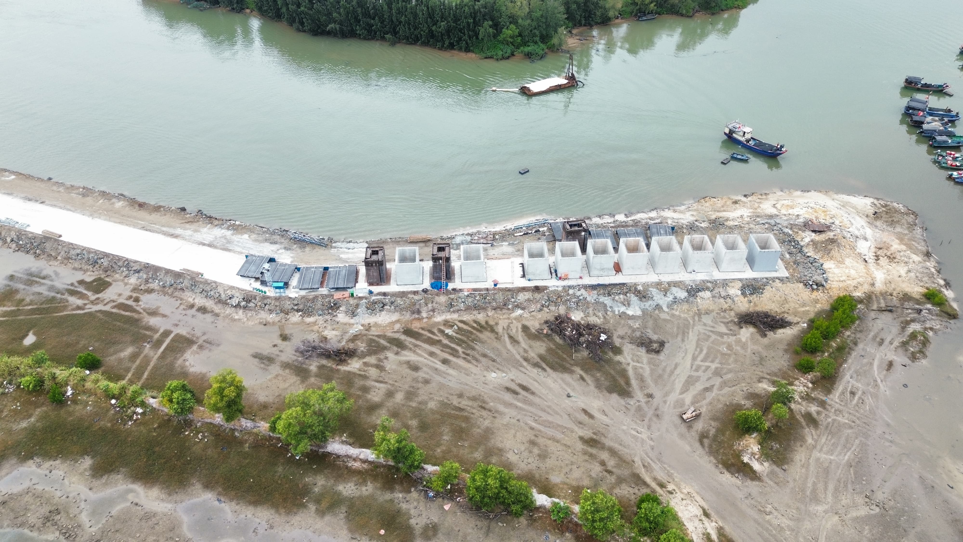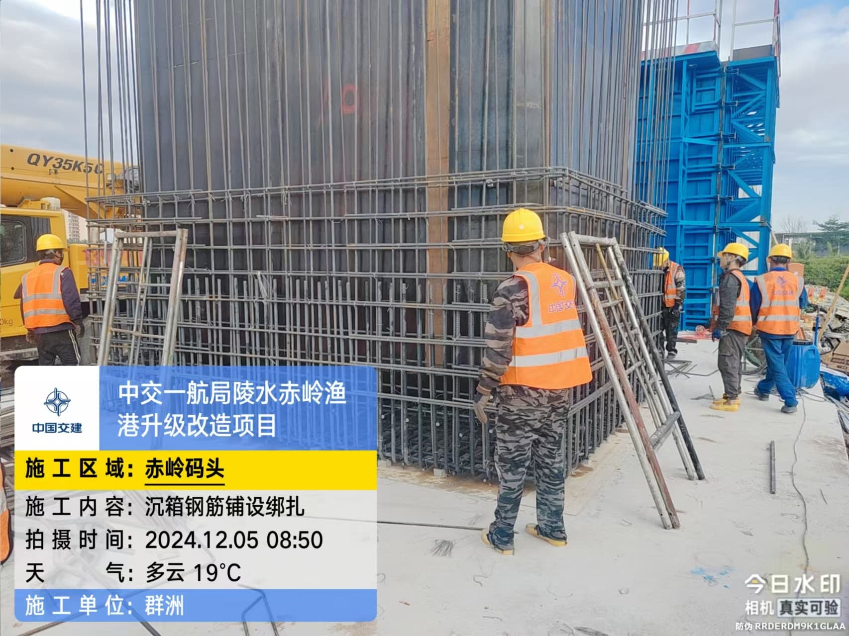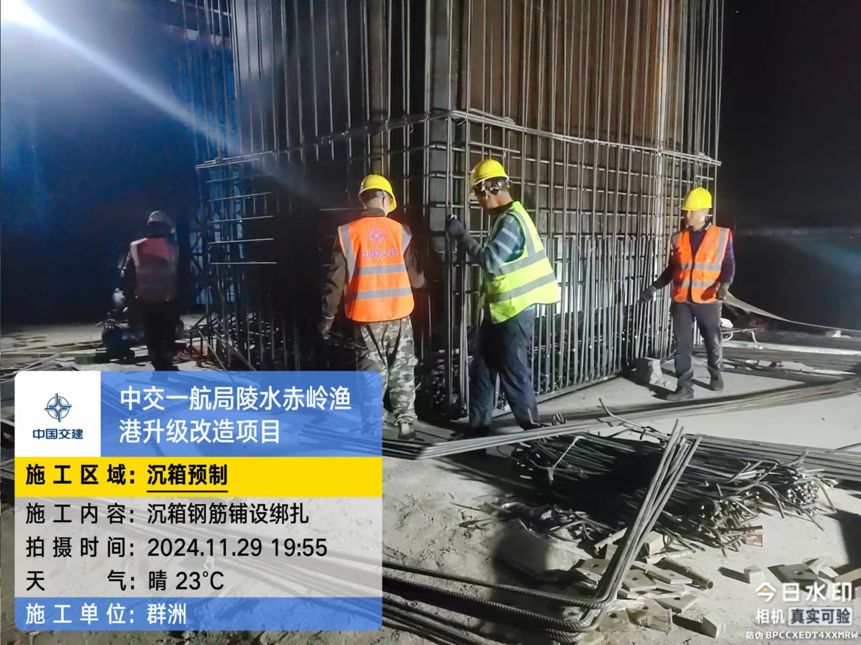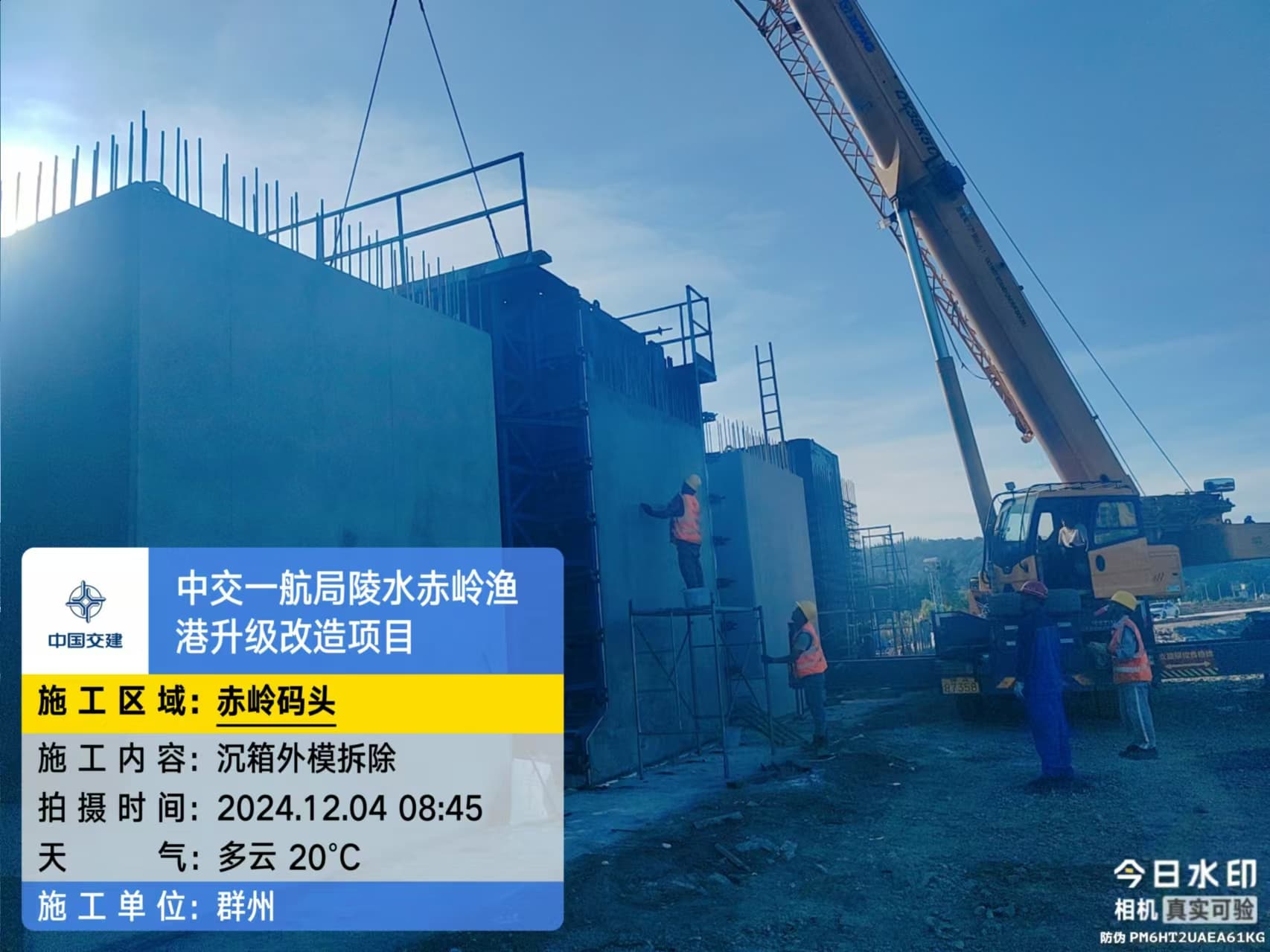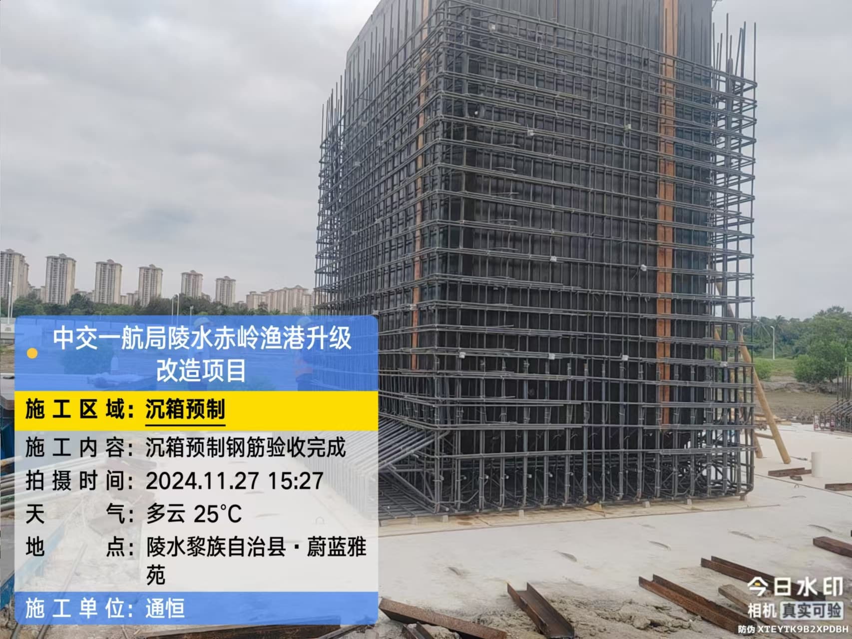 沉箱预制、抛石回填平整、钢筋绑扎、模板支拆、混凝土浇筑